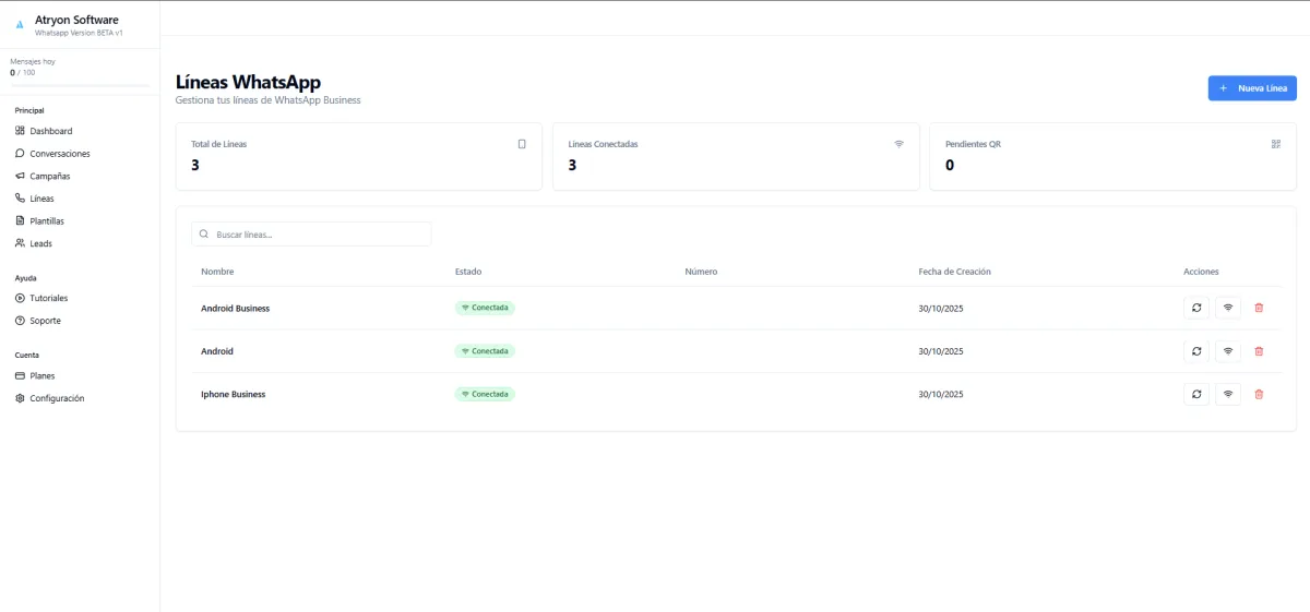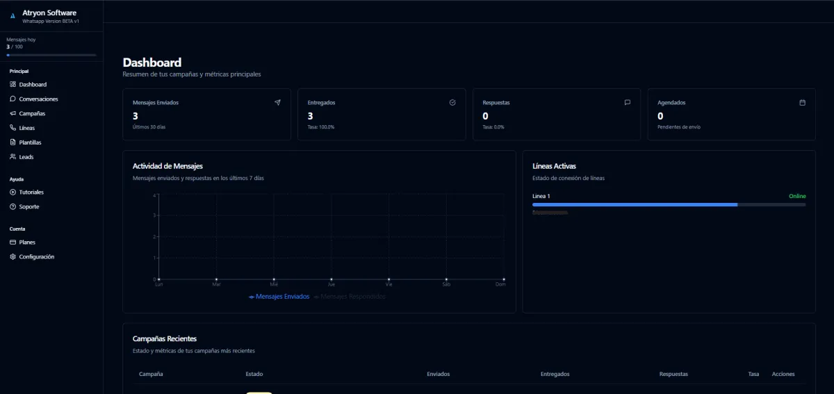 AtrionAI es el software diseñado para operar campañas de prospección a escala profesional. Nuestro motor automatiza el contacto outbound y garantiza el máximo volumen diario de mensajes, entregando nuevos leads directamente a su equipo de ventas. Es la forma más rápida y eficiente de llevar su negocio al siguiente nivel de crecimiento.
