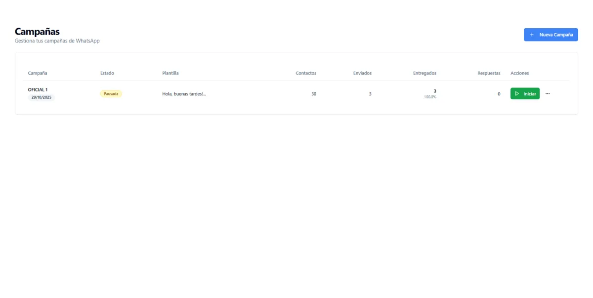 Visualiza mensajes enviados, entregados, respondidos y el rendimiento de campañas en un dashboard simple y claro.